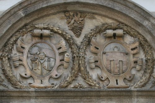On trouve également les armoiries d’une autre famille qui pourrait être celle de Vilém Slavata, grand chancelier de Bohême pendant la guerre de Trente ans et qui avait épousé la dernière Hradec.